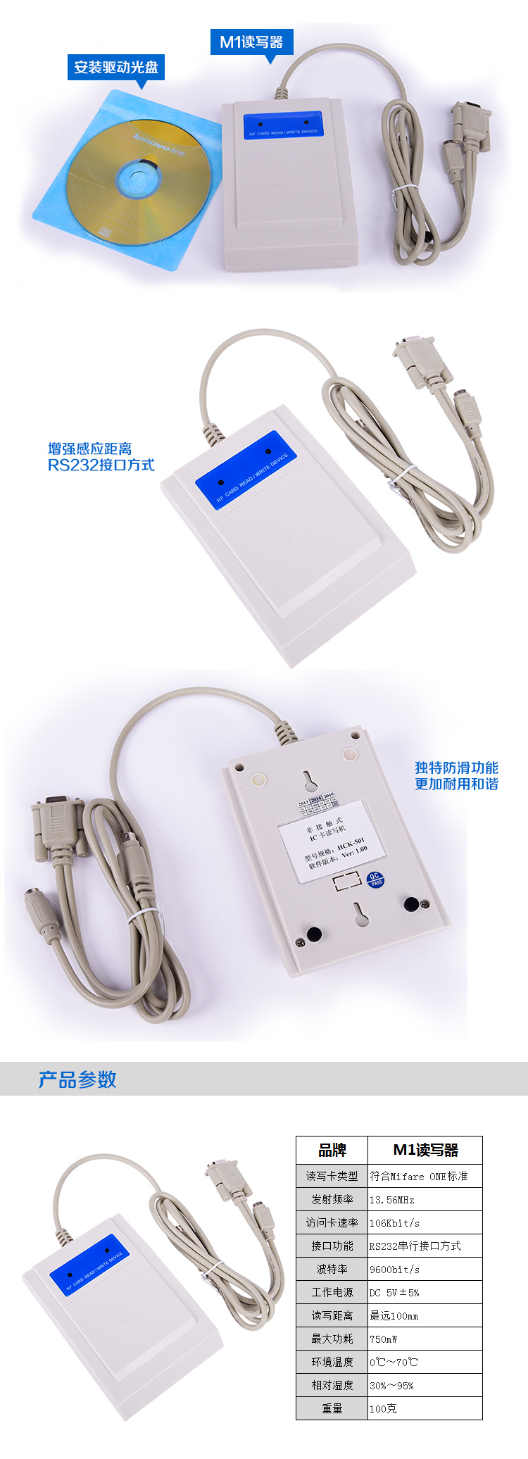 M1读卡器是非接触卡读写设备,它由主机、天线、串行接口等组成,通过RS232串行接口能实现同PC机的连接。随机提供的接口函数库可满足用户二次开发的需要;其完善、可靠的接口函数,支持访问射频卡的全部功能。目前该设备已广泛地应用于图书馆管理系统中。